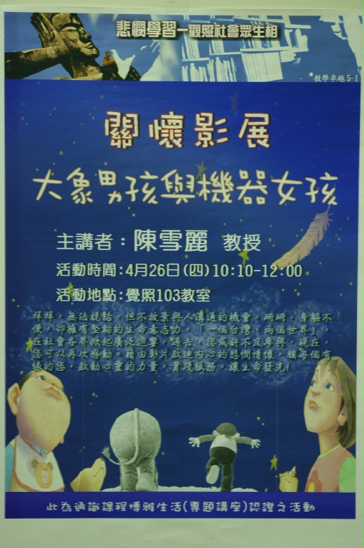 華梵大學外文三鄭景隆同學細說影片對他的影響。大象男孩祥祥的父愛令他動容,堅持不送美國當醫學實驗品的心情、不忍看祥祥抽血的心疼,重重地敲在心頭。機器女孩珊珊的勇敢令他讚佩,痛苦學步的歷程中,她一句句「珊珊加油!」深深地嵌在心底。