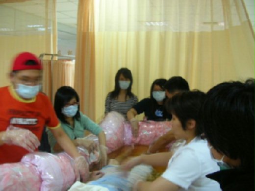 美術系的邱慶桐及沈正一同學,在為一位老先生做肌肉伸展時,不斷的以輕鬆的口吻持續和床上的植物人對話,努力克服心裡的障礙及緊張,不僅表達了對生命的尊重,這種無聲與有聲交疊的互動更是令人動容。