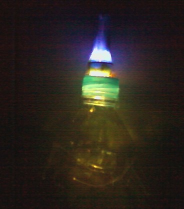 在一片漆黑之中,只見燈籠發出閃亮的色彩,白色的燈光用黃色玻璃紙與藍色瓶蓋結合化成黃光芒,只見瓶蓋變化成了翠綠色彩,顯得格外耀眼。由透明瓶身剪成的花朵形狀,隱約發出淡淡的橘光,似有若無彷彿置身在異次空間,並且響起鼓勵了掌聲。
