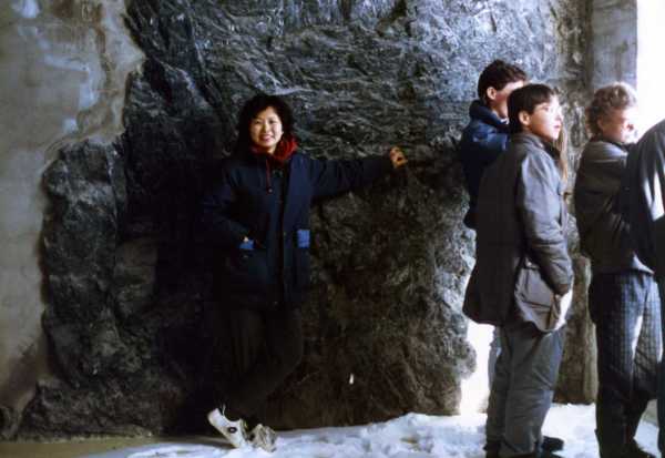 (照片74:這是在少女峰的冰河(冰川)觀察室照到的照片,各位可以想像那兒的氣溫有多低,注意到我腳下的冰沒?那可不是外面的冰跑到室內裡來,而是因為參觀的人太多了,我們呼出的水氣凝結而成的冰,厲害吧?再說一個,這冰河的冰很多都是很早以前就留到現在的古代冰,因為時間太久,所以冰河裡的冰裡都呈現微微漂亮的綠色,這可能是因為裡頭長有黴菌或是苔蘚的關係。)