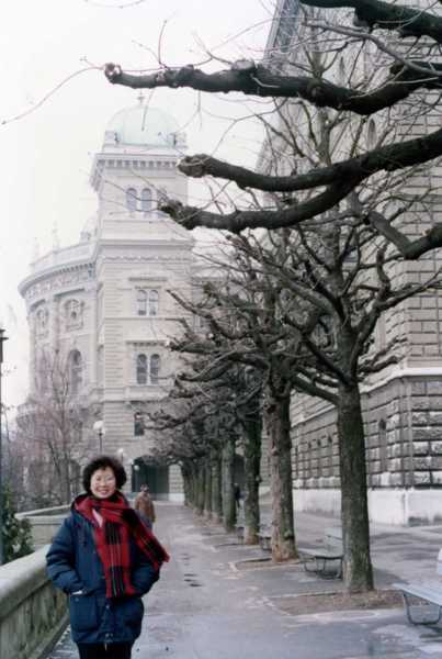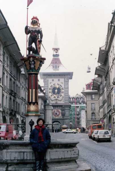 (照片78:這是在伯恩的城門口照的,注意到地上的石磚沒?這是當地一位老人家用英文告訴我們──這些鋪地的石頭都是在二三百年前的十七八世紀就鋪設好的,那時的人們就知道用石柱來鋪馬路。經過長久的歲月,證明他們果真有遠見,這麼長久的時間,從不必浪費錢在整修道路上。)