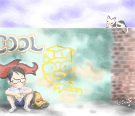 午後,他莫名其妙在後墙噴上大大的豬頭。
