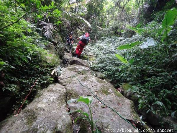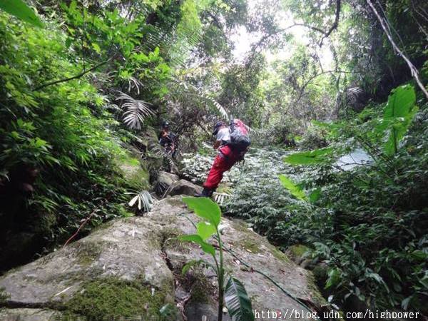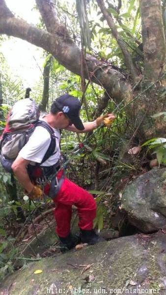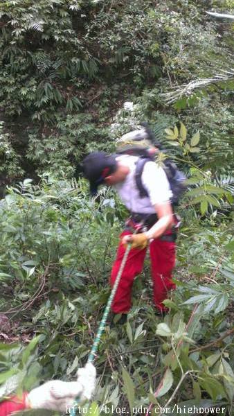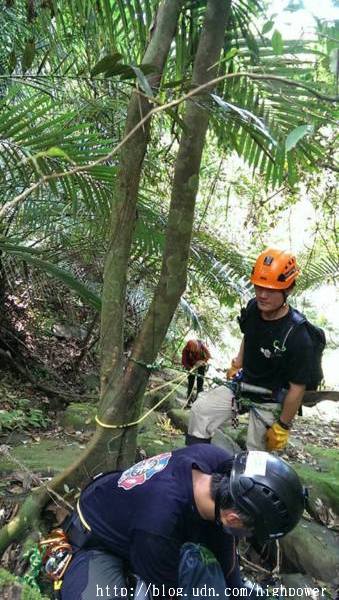 在第一登山口勤務指揮所接受搜索任務分配,我們鐵漢是分配主峰東南面下切溪谷至水庫,下切沿路處處都是長滿刺的黃藤,只能砍砍砍! ! 一路運用回收系統架繩岩降運用回收系統這條路線無人走過沒有痕跡切,到最後接上農用水管路,下到有道路的地方,也有人除草剛離開,休息吃午餐 這道路我們繞了繞,死胡同一個! 從圖上知道臨近船用小碼頭,沒船好坐,勢必要沿稜線向上折返了,就多搜索一條線殺上去吧! ..高溫與有限的飲水,考驗著叢林定向與搜索耐力,隊友們咬著牙開路向上,也不敢大意周邊的線索!傍晚17:00回到勤務指揮所!!