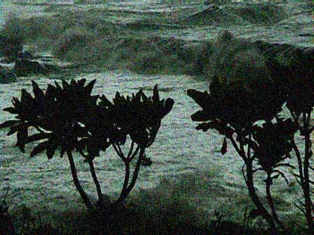 艾教授那次在海洋科學研究船上,是陪同他的指導教授參加東太平洋的聖嬰現象研究;他早就忘了這事,直到這一天早上面對記憶中最壯觀的大雨。往日,早上七、八點的時候,站在這片玄關上,透過外牆鋼架上的葡萄藤枝葉間,他可以看到環河路上快速追逐的車陣。這些川流不息的汽、機車聲響,會在高豎的防波堤牆面和樓群之間,同時會在樓群之間的巷、弄、任何空間中,迴旋出不停的尖嘯和呼嚎;現在,在厚重的雨瀑之後他只模糊看到防波堤牆面上的爬藤綠葉和空寂的路面;除了大雨的喧嘩,這扭曲變形的世界也異樣黯啞。他數了數指頭,心想今年也許是個反聖嬰年,同時腦海中遼闊的太平洋海面高低陡峭的傾斜起來,西向的強風在上面推擠溫暖的海水的表層,將大氣的底層像燒開水那樣燒出騰騰霧氣。