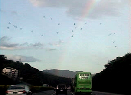 我當然看過許多次彩虹,但,不曾看得那樣貼近…那是昨天大早,當我在北二高行車…我才上高速公路,就在車頭左前方的天空看到一組亮麗霓虹。隨著公路曲折,彩虹也忽前忽右…當我從木柵來向要鑽進中和隧道,細雨紛飛中那道彩虹竟然是一頭從我車前的引擎蓋上向左前彎上隧道口的山壁和天空;我帶著這霎那的記憶,鑽進黑暗的隧道中,毛骨悚然,直到鑽出另一邊的出口。心想:今天或需關掉音樂休息心思專心開車…極美好的經驗,竟會令人驚懼…不知為何….
