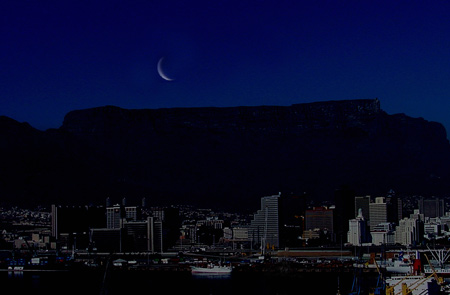 第一批來到開普敦的歐洲人,就是那些帆船上的海員,他們看到怪異的桌山Table Mountain,喊他為灰爸爸Grey Father,現在,這山像一座陰暗的城牆或者一片廣大的黑影,和我們隔著船燈照亮的外海、一條直長的波堤和一個遙遠的內灣,聳立在華燈琳瑯的街岸。在這樣的景象中,我們錨泊了三個白天和夜晚。