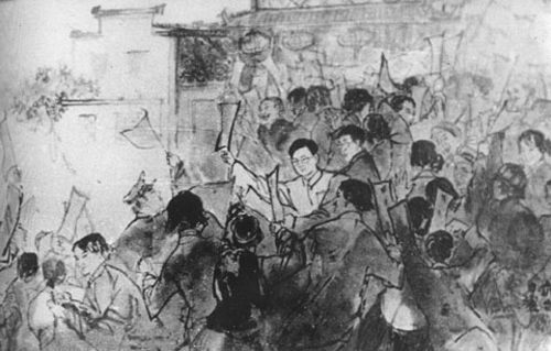圖:武昌起義,民眾剪辮上街,響應革命(張太雷紀念館)。
