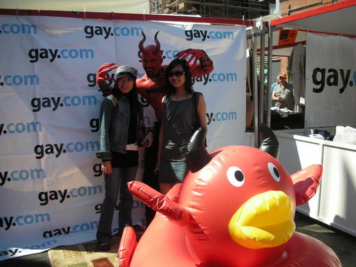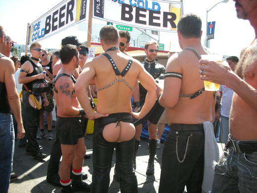 話說每年於九月最後一個星期日舉行的Folsom Street Fair, 重點在於"皮", 眾多與會民眾身著SM皮件及配備, 大剌剌地走在Folsom街上與民同歡. 其中不乏男同志們露胸裸臀, 或全裸上陣. 逛大街溜鳥的俠客們, 有如候鳥過境, 一波未平, 一波又起, T走在人群中, 雙手緊握我的相機, 深怕一不小心手一揮, 打壞了鳥兒的翅膀. 甚至, 更有人直接用起SM道具, 現場"玩"了起來. 有位仁兄在總統候選人Obama的相片前全裸"自玩", 看得圍觀群眾頻頻拍照, 獨樂樂乾脆眾樂樂, 要玩大家一起玩, 不論男幫男, 女幫女. 這個讓T及女性友人看得嘖嘖稱奇的展, 真的是太超過了!!!!!!!