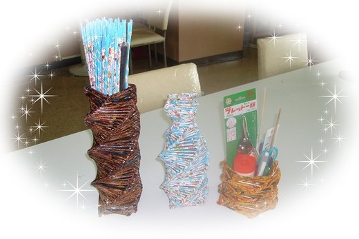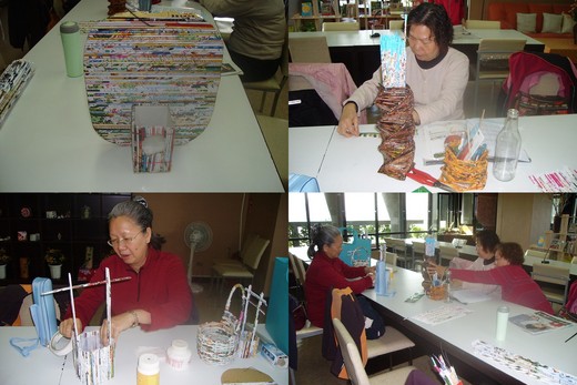 學員取材於廣告廢紙,一張一張細心的捲成長條狀,使之成為如「竹篾」般的功能,得以編織各式功能、大小不一的容器。