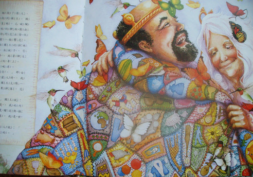 「不管怎樣,」拼被人還是對國王說:「這一床最美的拼被是特別為你縫的。」接著把拼被披在國王身上,此刻的國王,感到無與倫比的幸福與滿足。