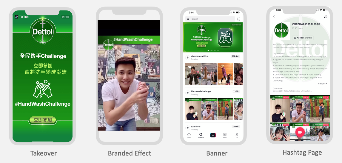 知名消毒水品牌滴露於2020年初肺炎疫情期間,於抖音的創意廣告,便選擇了挑戰賽廣告模式,以 #HandWashChallenge 為主題,結果獲得相當不錯的成績,所有參加者上載的短片共錄得32億的驚人播放量。