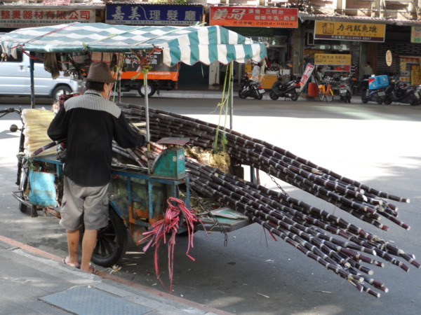 上班途中,甘蔗伯已將三輪車載來兩大綑甘蔗削了起來,紫色發亮的長棍在甘蔗伯的手裡乖乖退去外衣,展現白裡透甜的風貌,老翁閑情氣定將一根一根削去外皮,一節一節裝入袋中,等待顧客上門購滿. 高架橋下公園邊,早上停著一輛三輪車載滿甘蔗,甘蔗伯每天削著甘蔗,從長長紫皮外觀到一袋袋白肉脆桿,阿伯將一根根的紫色甘蔗化作一堆白色小山丘,像魔術師般變了一齣視覺藝術秀.
