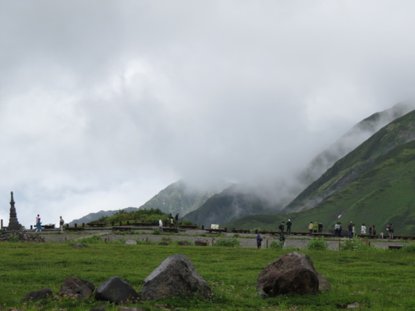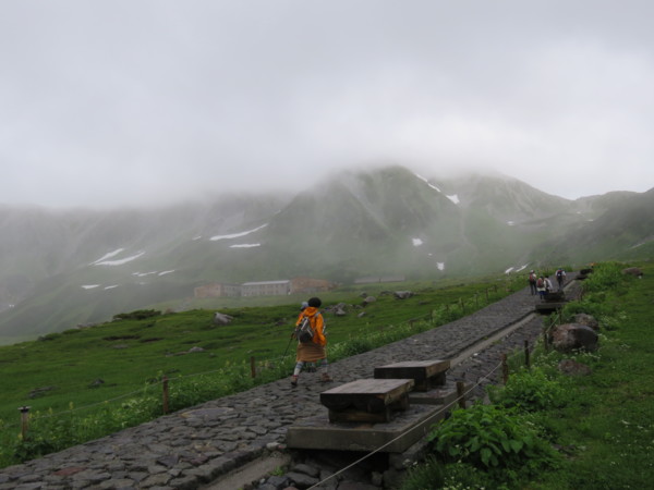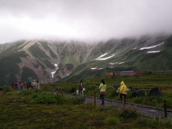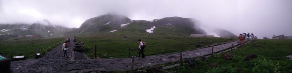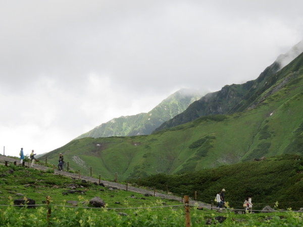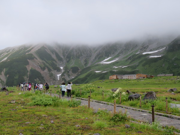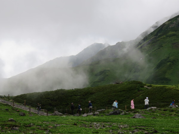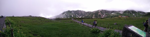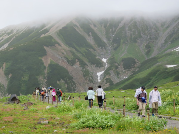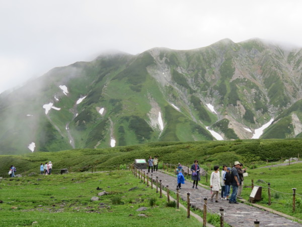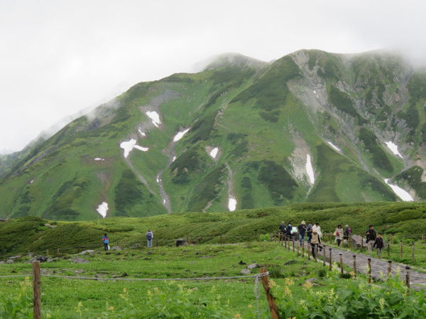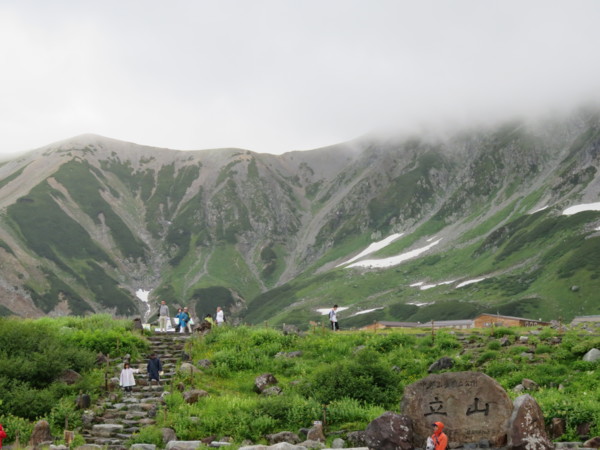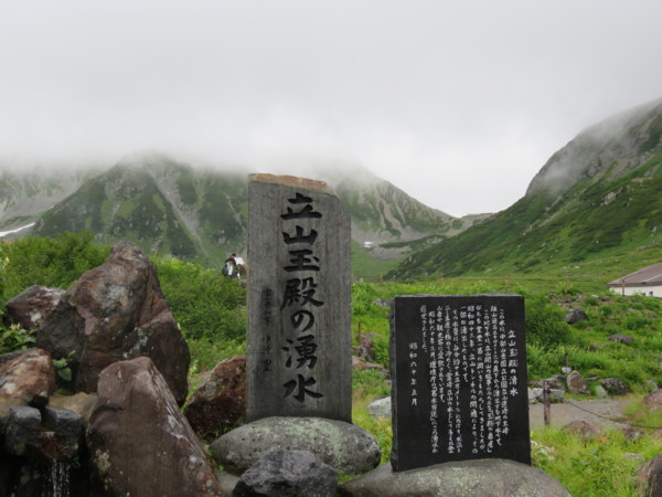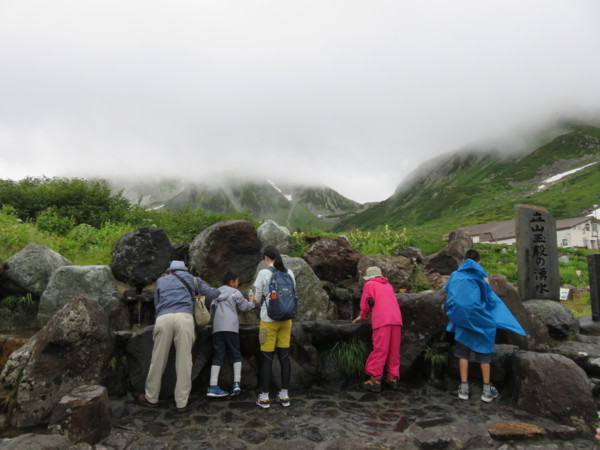 來到室堂平,被稱為《立山三山》的雄山、淨土山、別山聳立於眼前,為群山所環繞,高山天氣不穩雲霧飄渺,時而晴時而小雨,宛如山上仙境般,走在環山步道上欣賞高山的美麗花草,不時有登山客揹著厚重的登山背包往山頂走去,還有生態解說員帶隊解說美麗的花草與石頭。山上的雲霧起變化,陽光趁著空隙揮灑在綠色草原上,走在步道上的人們彷彿珍珠項鍊的粒粒珍珠,倘佯在綠意山區裡頓覺與世隔絕,置身在無憂無慮的人間仙境,,喝口天上神泉保你延年益壽,看著日本人也大桶大桶接回去享用,遠山的白色殘雪與青色山脈令人眼睛一亮,這裡的空氣多麼清新令人多吸幾口讓人舒怡。