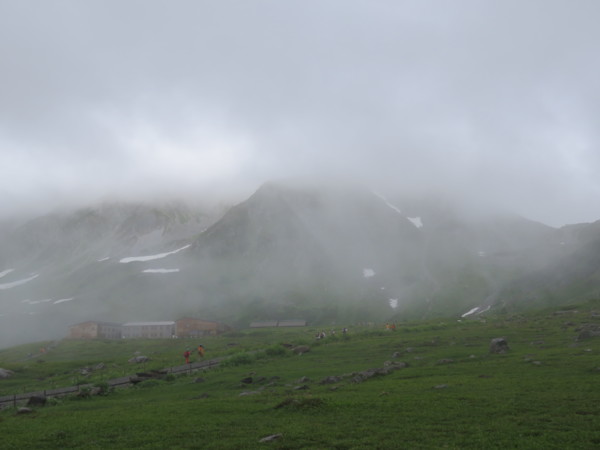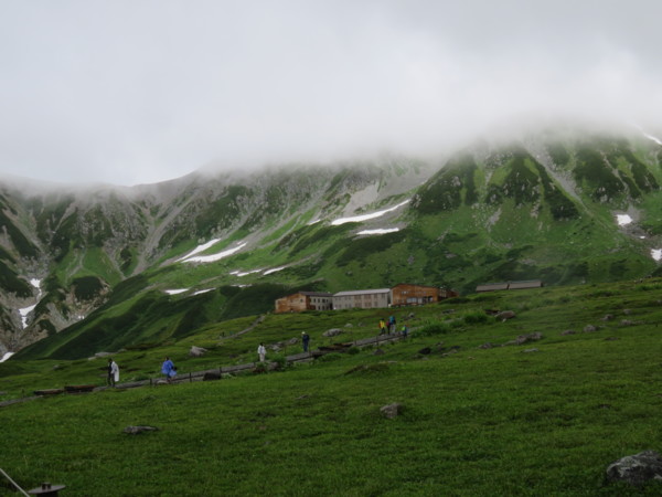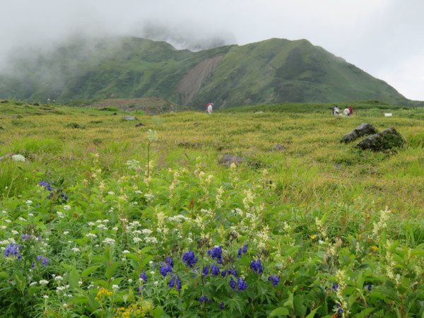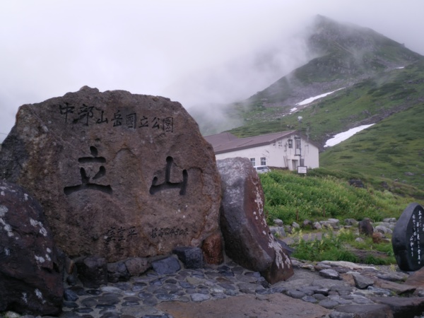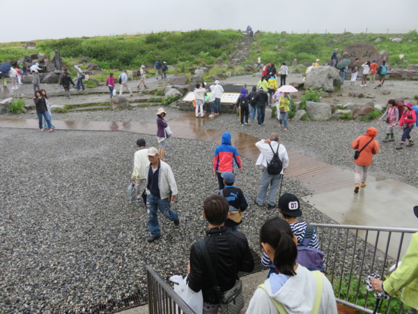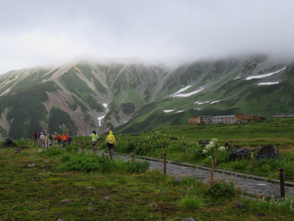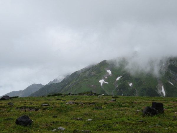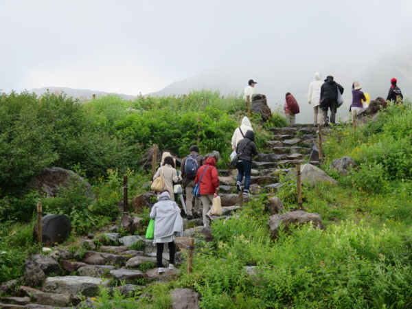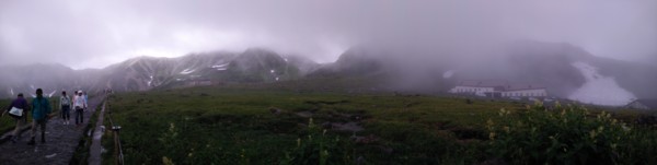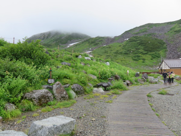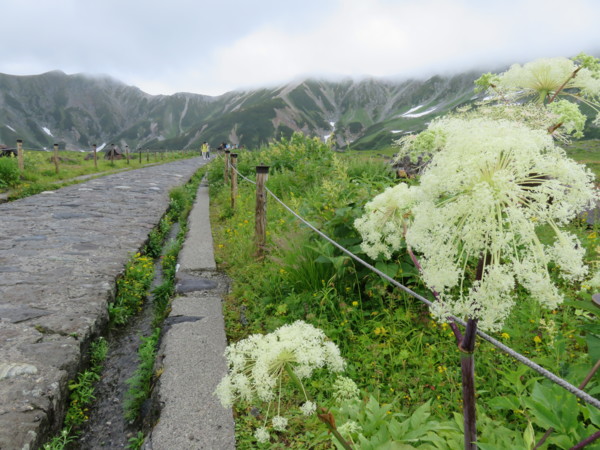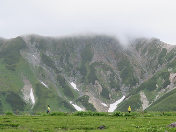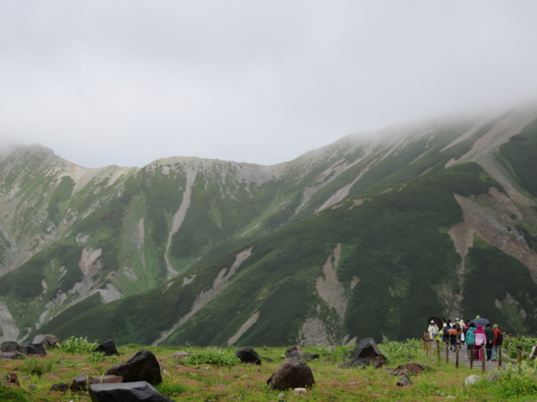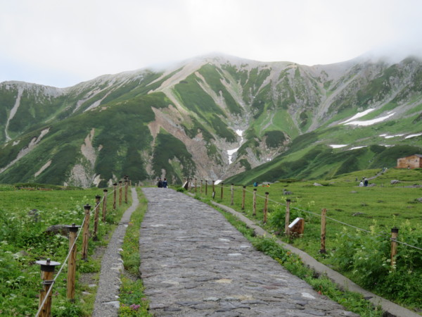 來到室堂平,被稱為《立山三山》的雄山、淨土山、別山聳立於眼前,為群山所環繞,高山天氣不穩雲霧飄渺,時而晴時而小雨,宛如山上仙境般,走在環山步道上欣賞高山的美麗花草,不時有登山客揹著厚重的登山背包往山頂走去,還有生態解說員帶隊解說美麗的花草與石頭。山上的雲霧起變化,陽光趁著空隙揮灑在綠色草原上,走在步道上的人們彷彿珍珠項鍊的粒粒珍珠,倘佯在綠意山區裡頓覺與世隔絕,置身在無憂無慮的人間仙境,,喝口天上神泉保你延年益壽,看著日本人也大桶大桶接回去享用,遠山的白色殘雪與青色山脈令人眼睛一亮,這裡的空氣多麼清新令人多吸幾口讓人舒怡。
