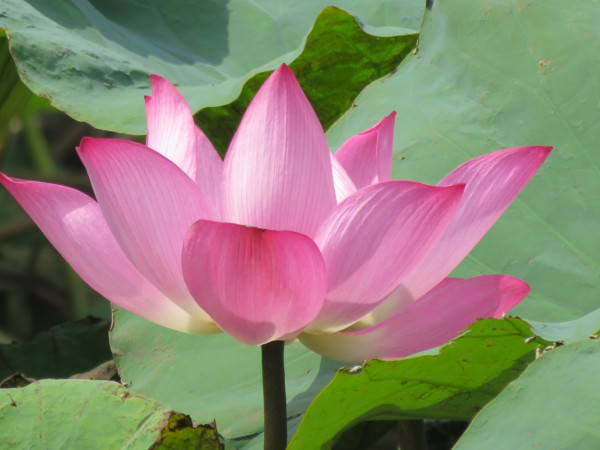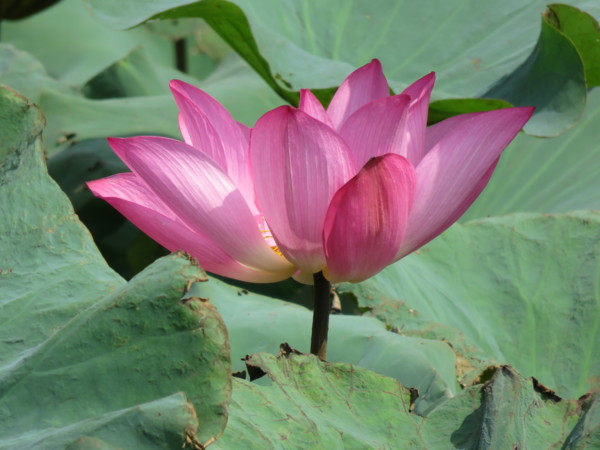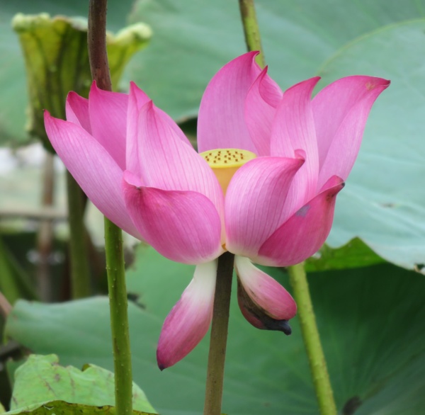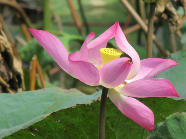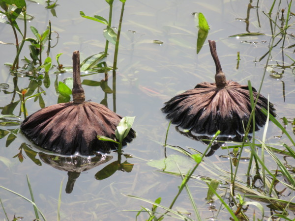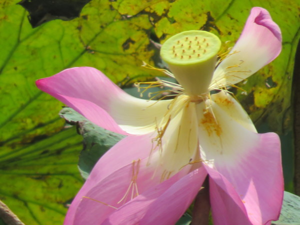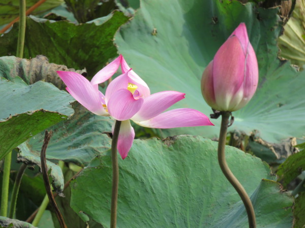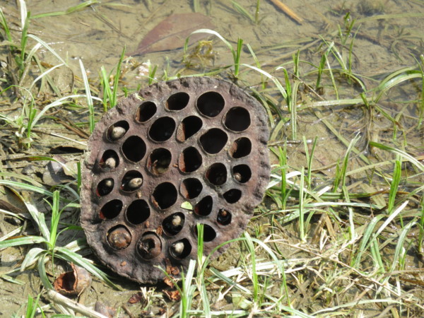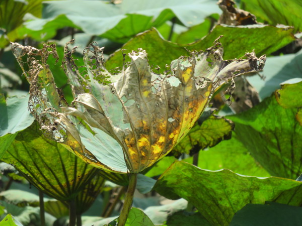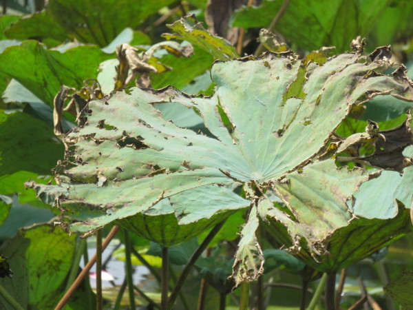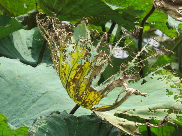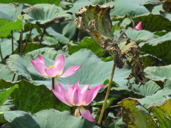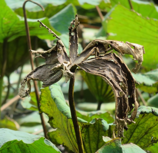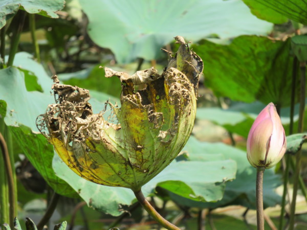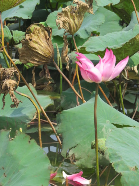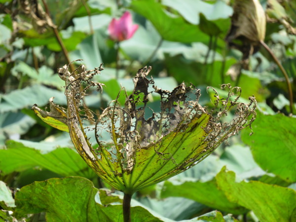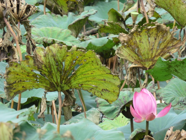 經歷了兩次颱風肆虐,儘管已過夏荷賞花季,依然挺著殘葉展現粉紅花姿.蓮蓬已落滿池,殘枝裂葉更顯生命的堅卓,池裡新葉正竄出展現生機!