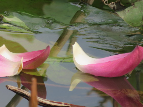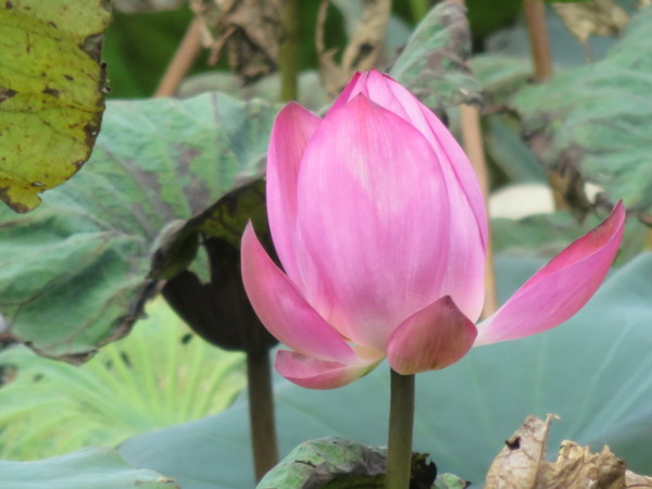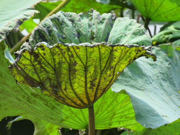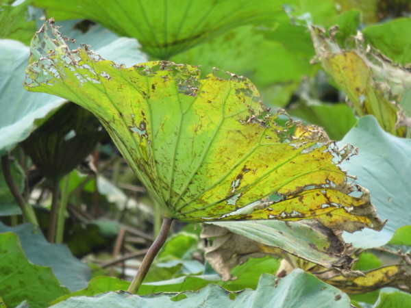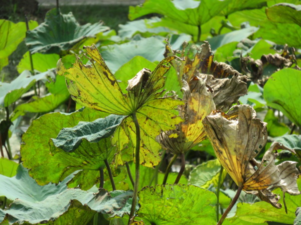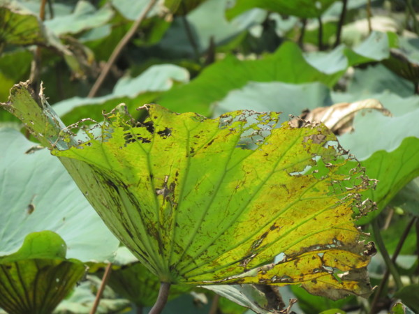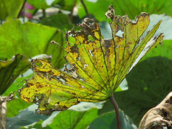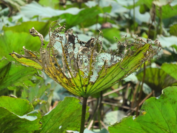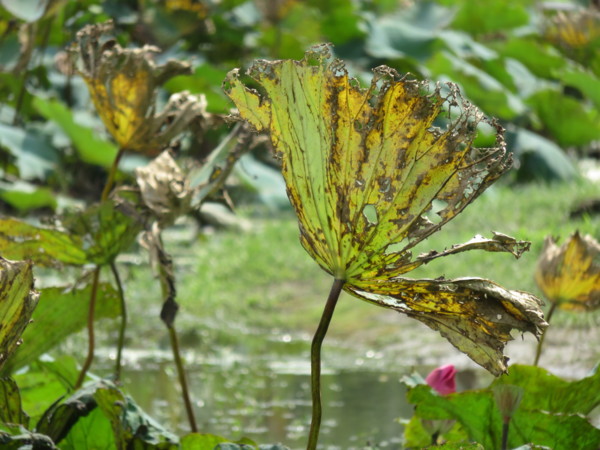 殘葉絲絡的美,雖然有點淒涼帶點不完全美的禪意,滿園蓮葉雖敗損然生機盎存.小小池塘生態豐富,池裡不時有魚躍升的落水聲,在殘枝破葉中隱約瞧見美麗的花朵隨風搖曳.