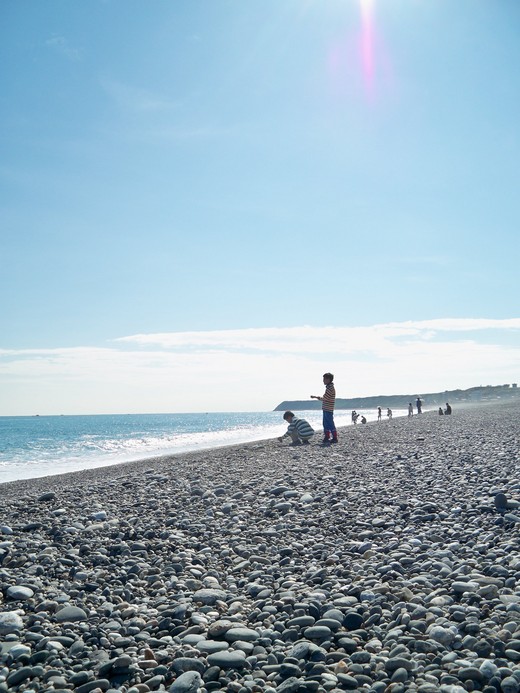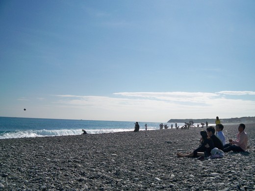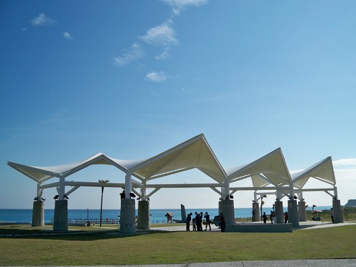 太平洋豪邁萬千,蔚藍的天空陪伴著幾朵白雲,不遠處又有青山相隨,民眾悠閒觀海,風景十分美麗