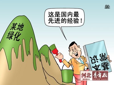 俗語說「老黃瓜刷綠漆」是「裝嫩」,那山崖上的石頭又是為了什麼?陝西省渭南市華縣一些山崖,最近就被人發現刷上了綠漆。當地國土資源局礦產辦李主任稱,該局正在對裸露的山體逐步恢復植被,刷上綠色只是一個過渡期,這是最先進的經驗,從外地學來的。
