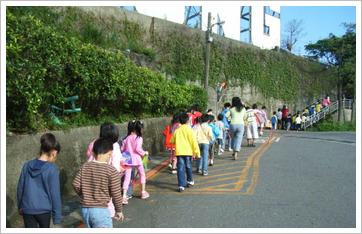 相片說明:學生魚貫步出校門,經過KEELUNG地標,往太平佛山早起會出發