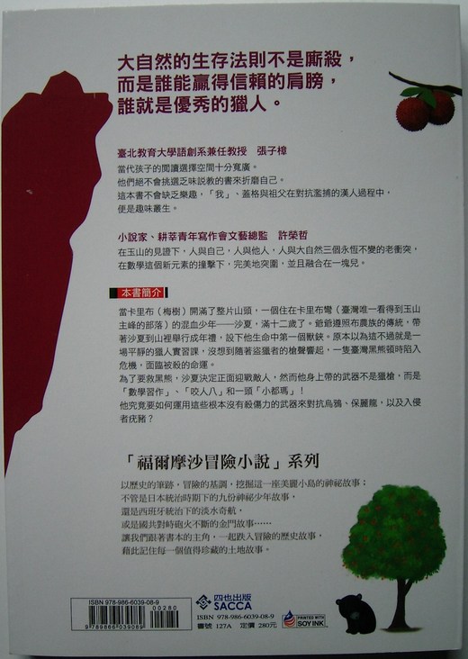 其實今年我還看了耕莘學長姜天陸的《在地雷上漫舞》、同學張淑美的《老蕃王與小頭目》都寫得很好,但屬於悲劇,所以個人不是很喜歡。而故事背景設在南投山地部落的《卡里布彎‧數學獵人》雖然也有描寫人生的黑暗面,可是佈局精巧,將我們曾經念過的數學習題加上新的詮釋,在危機處理中穿插知識(不像某些少年讀物流於說教),讀來令人愉快而且感動,不愧是花了十年光陰寫成的。很期待四也出版的這一系列【福爾摩沙冒險小說】。