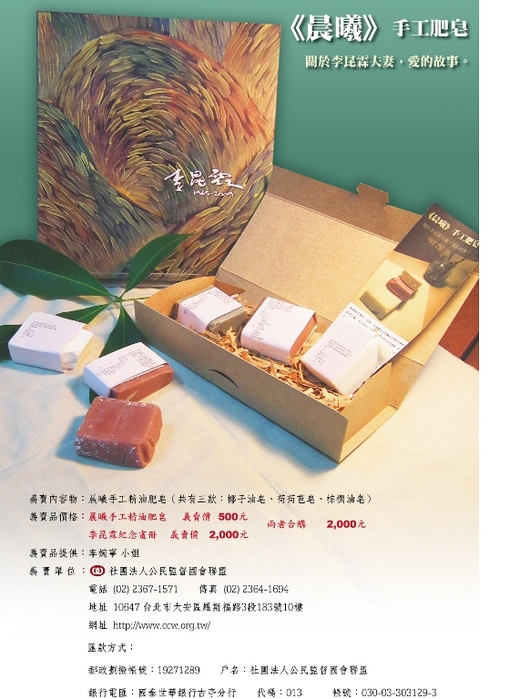 今年11月8日是李昆霖逝世一週年,當婉寧知道公督盟九月的募款還短缺350萬,她特別製作了100份手工精油肥皂幫公督盟籌款。每套三塊,並附李昆霖「晨曦」畫作搭配精美紙盒包裝,義賣價500元;李昆霖紀念畫冊定價2,000元;兩者一起訂購,則只收2,000元,所得扣除成本,將全數捐給公督盟。