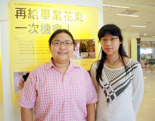 【公民記者何宗勳、草履蟲聯合採訪】每年到了畢業潮,送花成了最方便的賀禮,但是如果能夠把一束一束的鮮花再利用,不但環保又有意義。今年由台大森林系同學王若帆、吳美儀和師大蔡思怡所舉辦「再給畢業花束一個機會」獲得經濟部能源局主辦「節能減碳、用行動愛地球」,獲得影響力獎第二名。得獎人之一王若帆同學表示,這是對她們最佳的鼓勵,讓她們有信心一年一年舉辦下去。