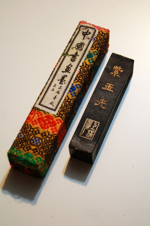 隨著比賽獲得的獎金,我開始能夠添構一些更好的文化四寶,我買了「萬世師表」、「歲寒三友」、「大中至正」等墨塊。一些比較在乎的作品,開始用其它的墨條。之後,中國墨條可以進入台灣,我有機會挑選質感、色澤俱佳的墨,其中我最愛一條上海墨廠製作錦盒裝的「紫玉光」油煙墨,長條正方形,造型優美、烙印在墨上面的書法非常典雅,墨香非常迷人。之後我又添購「黔川點漆」墨條等,至今都還捨不得使用。