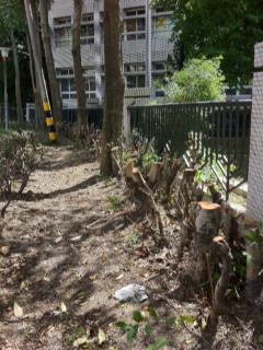 日前有居民發現上百棵樹全被砍成像膝蓋高,宛如原住民「出草」。社區吳媽媽打電話去公園處詢問,為什麼要這樣砍樹?承辦人員連這些事什麼樹都講不出來,只一再說這是灌木,因為過去學校都沒有剪修,現在要剪修。吳媽媽痛批,樹砍成這樣會活嗎?
