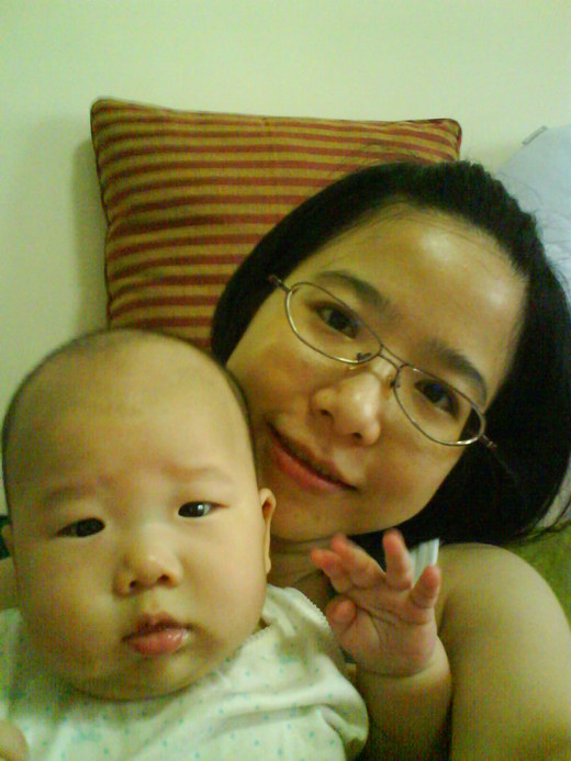 才四個半月大的他楞楞地看著我,