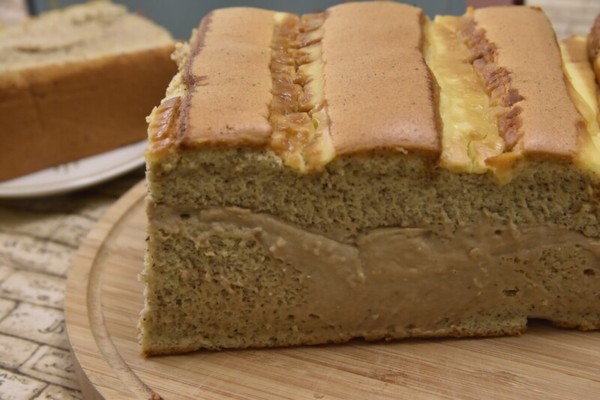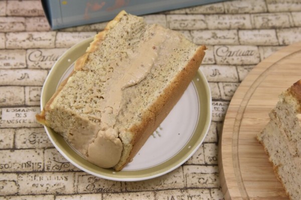 蛋糕表層有奶茶醬拉出的拉花,蛋糕本體的顏色跟我們平常吃到的古早味蛋糕不太一樣,這是因為厚奶茶蛋糕是使用伯爵茶口味的蛋糕當基底,讓茶香更濃厚