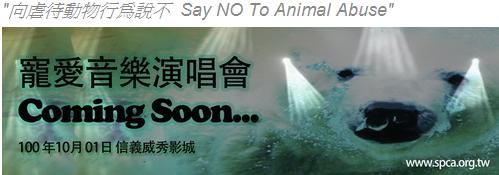 為慶祝今年建國百年及一年一度 『 世界動物日』之紀念節慶 ,主辦單位台灣防止虐待動物協會 (Taiwan SPCA) 特別在 10 月 1 日 ( 六 ) 下午 3 點至晚上 9 點 於信義威秀廣場,規劃一場結合藝文、音樂、動保 的 音樂演唱會 , 並邀請了許多主流 / 非主流愛護動物的知名藝人歌手 , 向大眾宣導動物福利議題,並喚起全民重視動物權利及正確飼養觀念 、 飼主責任及鼓勵大家,以行動來保護動物愛護地球,讓台灣成為真正 友 善動物的國家。