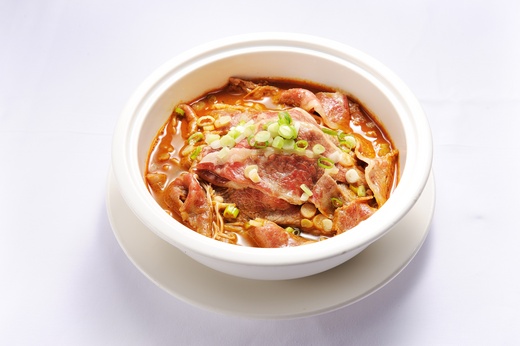 椒、香茅及黑白胡椒等,以20多種辣椒、香料煉製的祕製麻辣醬,調製成辣而不嗆、麻而夠味,香氣馥郁又可直接喝的麻辣牛肉麵;經典的「煲臘腸雞飯」以港式煲仔手法製作,主廚運用自製臘腸一同入鍋蒸煮,肥瘦相間的臘味香氣特佳,搭配香Q米飯與底層的金黃色鍋巴,起鍋前再淋上甜豉油,煲仔帶出的特有飯味,令人食指大動;至於「鮑粒章魚飯」同樣屬於廣東老菜,但因為製作起來相當麻煩,所以在台北市內並不容易吃到。