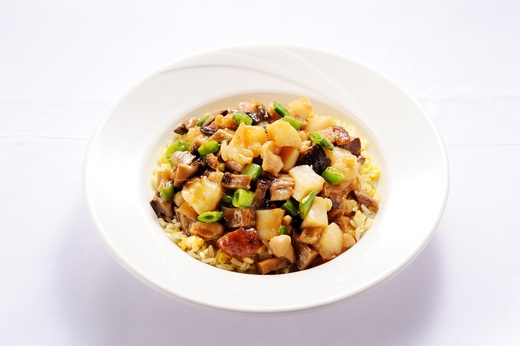 其做法主要是先將飯與蛋一起炒好,接著放進由章魚、干貝與鮑魚汁一起蒸煮的高湯之中續悶,悶到高湯鮮味整個進到炒飯裡,再撒上一點青蔥,吃起來滿滿都是幸福香氣。