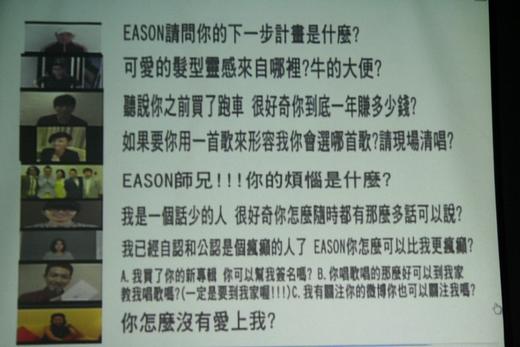 陳奕迅11月剛推出的"?"專輯獲得許多歌迷的熱烈喜愛,從11月中開始在台灣的三場巡演上,隨性的他在下半場都開放歌迷點歌,不少歌迷都十分鐘愛新專輯裡的歌曲,前日12/4號在高雄夢時代的簽名會上他清唱了Baby Song讓有到場的歌迷都樂歪了,而且有問必答:同在在昨日12/5日的記者會上,陳奕迅面對許多娛樂圈的"關係"好友發問當然言無不盡.尤其是最勁爆的是曾經合作過幾次的莫文蔚問:你怎麼沒有愛上我?這個問題讓現場一片嘩然,當然陳奕迅也作了妙答