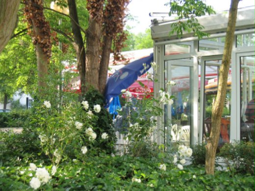 服務人員帶我們一大團人往餐館裡面走,燈光相當的昏暗,忽然柳暗花明又一村,來到一座完全透明的玻璃屋。歐洲的春夏即使到了晚上九點多,天都還是亮著的,因此玻璃屋整個非常的明亮,像在大自然戶外中。太陽雖大,玻璃屋是建在大樹下,只有陽光會穿透進來,十分舒服。
