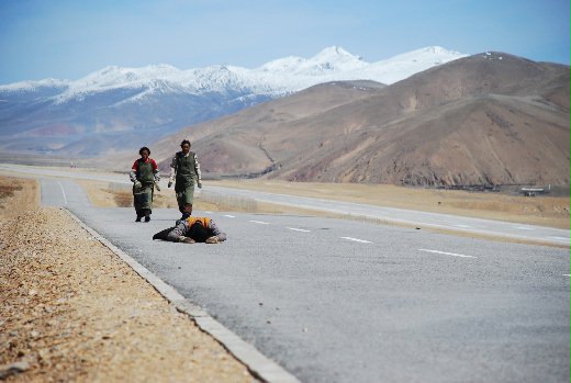 070519 在世界上最高的西藏邦達機場旁的國道214上徒步朝聖的藏人