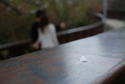 一片抵擋不住頑劣山風的吉野櫻花瓣飄落在欄杆上(070328)
