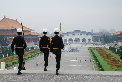 照片中,是中正紀念堂交接中的正要走下長梯的衛兵