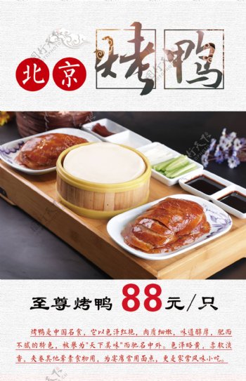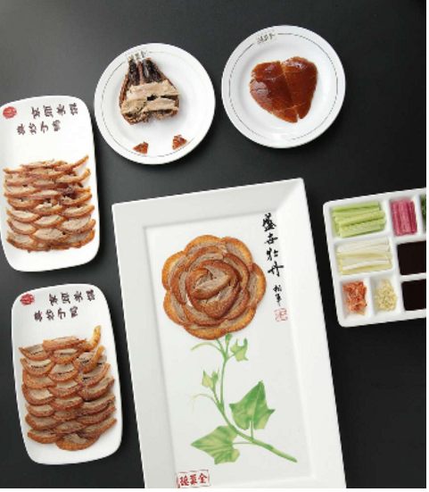營養:經研究表明:全聚德烤鴨中的蛋白質含量約為16-25%,遠遠高於畜肉,含有維生素、多種礦物質以及人體需要的全部氨基酸;脂肪含量約為7.5%,其中主要是不飽和脂肪酸和低碳飽和脂肪酸,利於人體所需營養以及消化吸收。鴨油所含的膽固醇遠低於其他動物油,屬於較有利於人體健康的動物油脂。全聚德烤鴨採用掛爐、明火燒棗木的方法烤制而成。烤鴨成熟時間為45分鐘左右。其成品特點是:剛烤出的鴨子皮質酥脆,肉質鮮嫩,飄逸著棗木的清香。鴨體形態豐盈飽滿,全身呈均勻的棗紅色,油光潤澤,賞心悅目。配以荷葉餅、蔥、醬食之,腴美醇厚,回味不盡。