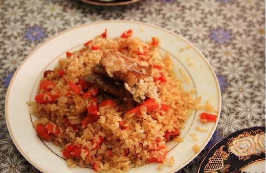 羊肉抓飯,原是烏孜別克風味飯食,稱“頗勞”,也是伊犁各族人民最喜歡的佳餚。少數民族食用抓飯時,先淨手後掇而食之,故漢語稱之為“抓飯”。主要原料是大米、洋蔥、胡蘿蔔、羊肉(牛肉或雞、鴨、鵝肉也可),有的還放葡萄乾、杏幹等。抓飯油亮生輝,肥嫩爽口,營養豐富,是民族風味飯食的上品。館子裏的抓飯一般分羊肉抓飯和素抓飯。要吃素抓飯必須事先聲明一下:“老闆,來個素抓飯”。否則,鐵定給的是羊肉抓飯。一份羊肉抓飯都有一大塊肉骨頭,想多吃肉也可以聲明多要,當然要多加錢了,一份素抓飯目前的價格大約是5元,一份羊肉抓飯12元,多加一塊肉多收7元錢。