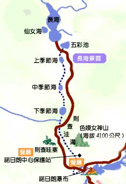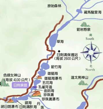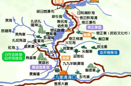 沿路有【劍岩懸泉】、【天鵝海】、【芳草海】、【箭竹海】、【熊貓海】、【五花海】、【孔雀河道】、【金鈴海】、【諾日朗瀑布】,搭車南下到【老虎海】、【樹正瀑布】、【樹正群海】、【臥龍海】、【雙龍海】、【蘆葦海】、【盆景灘】,再坐上了車子到溝口。