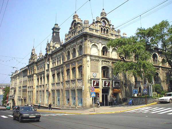 (10).符拉迪沃斯托克火車站 是符拉迪沃斯托克這片土地上最具17世紀俄羅斯建築藝術的代表作品,也是世界上唯一把港口和火車站建在一起的車站。它與俄羅斯遠東大鐵路(西伯利亞鐵路)建設同步,歷史上該火車站建築經過了幾次改造,現在的火車站大樓是按照弗科諾瓦洛夫的方案於1912年建成。它外觀精美古樸,充滿貴族氣息。主入口採用三聯拱門形式,屋內為冰刀狀屋頂,有許多小帳篷頂點綴其中,給人以複雜多變的視覺美感.;車站內部佈置很別緻。首先是天花板上的棚畫,是這棟建築的特色之一,棚畫的主題是“我們偉大的祖國”。上面有兩組繪畫,一側畫是符拉迪沃斯托克市容景象,有火車站、艦隊,蒸氣機車,中間的兩個人物是末代沙皇尼古拉二世和遠東總督穆拉維約夫阿莫爾斯基;另一側面是莫斯克的城市景象,有瓦西里升天大教堂,莫斯科大劇院等,兩個人物是俄羅斯的民族英雄米甯和波熱斯基。牆上裝飾為一個雙頭鷹的圖案,下面的圖案由鐵錨和飄帶組成,中間有一隻前爪抬起的老虎,這是俄羅斯符拉迪沃斯托克市徽。鐵錨和流水是海洋港口城市的象徵。這從上到下從小到大的三個半圓分別表示俄羅斯符拉迪沃斯托克是由金角灣、阿莫爾灣和烏蘇里灣組成的。