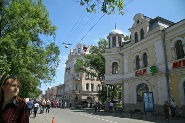 (9).斯維特蘭那大街:是符拉迪沃斯托克的主要街道,沿金角灣沿岸延伸七公里,在這條大街上有很多風格迥異的十八、十九世紀的歐洲各國建築物。在大街的起始點,是著名的維爾薩賓館,建於1908年,1990年遭遇大火,經過翻新改建,現在是符拉迪沃斯托克最高檔舒適的賓館之一。
