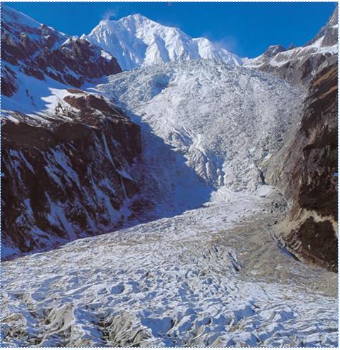 低處就能望見冰川從高峻的峽谷鋪瀉而下。特別是舉世無雙的大冰