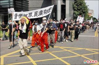 〔自由時報記者張協昇、張菁雅/台中報導〕台中市夜店業者及愛樂人士近800人,不滿「ALA」PUB火災發生後,市府一竿子打翻一船人,對相關業者強力斷水斷電,昨日下午走上街頭遊行,隨後在市政府前廣場以唱歌玩音樂等方式表達訴求,要求政府修改不合時宜法令,讓業者與樂團有生活空間。