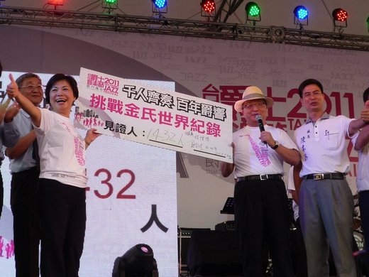 台中市政府今天晚間在后里馬場舉辦「千人齊奏,百年爵響」活動,來自全國各地薩克斯風樂手與藝人蕭煌奇等1432人,同時以薩克斯風演奏「中華民國國歌」、「四季紅」等曲目,打破今年由韓國1200人齊奏薩克斯風的金氏世界紀錄。
