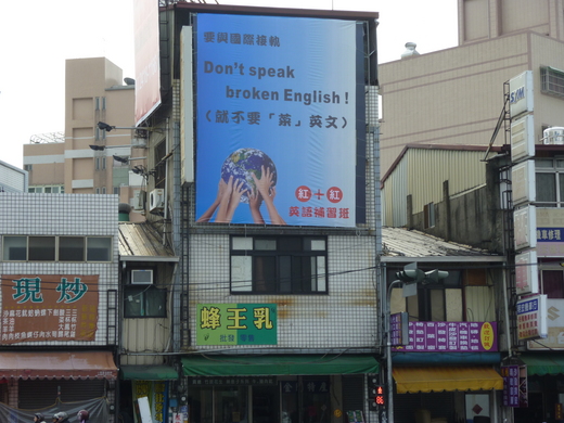 〔自由時報記者唐在馨/台中報導〕「與國際接軌Don’t Speak Broken English,就不要(菜)英文」,台中市街頭昨天出現一幅廣告,對此,民進黨議員黃國書查詢市府教育局,看板上的「紅+紅英文補習班」根本沒有立案,痛批「立廣告人不敢以真名示人,是低俗的負面文宣」。