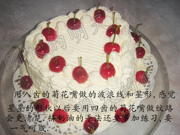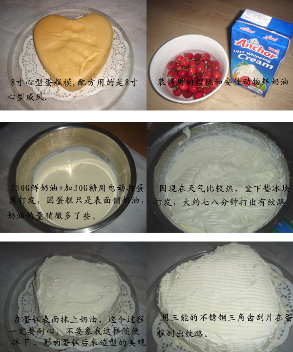 这个生日蛋糕除了烤蛋糕胚费了一些时间,后来的装饰过程倒挺快。我给蛋糕胚抹奶油时没抹平,挤奶油波浪时没想好就下手了,心型蛋糕右边的波浪一开始挤时没挤好我又补了一下,越补越难看,还是要一气呵成才好呀。