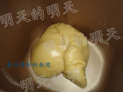⒋将主面团中的高、低粉加入⒊中揉至表面光滑(由于我2、3步都没搅匀,所以最后只有将所有材料投入面包机由面包机代劳了)。面团非常软、黏,用手工揉的话要有耐心。