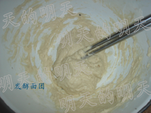 1、将发酵面团中的材料混在一起搅拌均匀(用牛奶将酵母先化匀),放在温暖处发酵至二倍大。